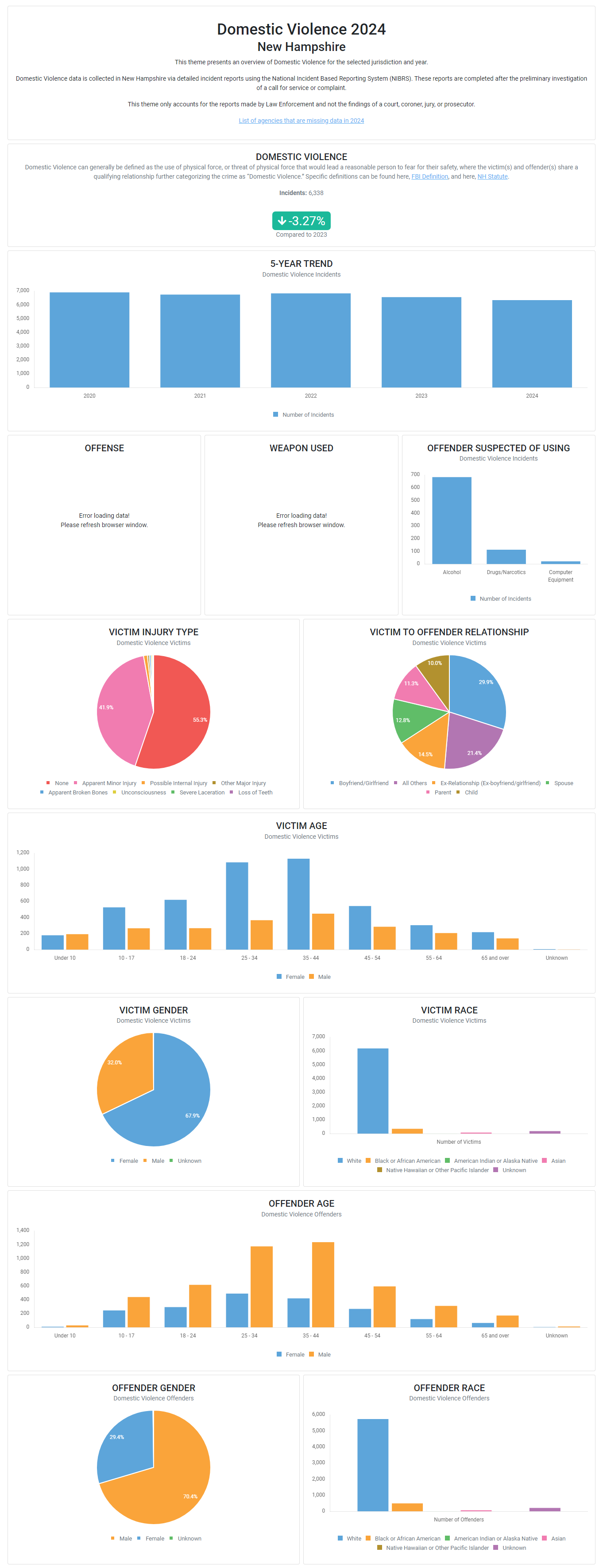 Domestic Violence data is collected in New Hampshire via detailed incident reports using the National Incident Based Reporting System (NIBRS). These reports are completed after the preliminary investigation of a call for service or complaint.